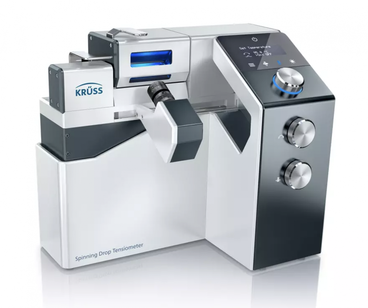 수상 경력이 있는 SDT는 회전 모세관을 포함한 모든 구성 요소를 견고한 외장 케이스 안에 완전히 밀폐한 설계로, 기존 회전식 계면장력 측정기에서는 보기 어려운 새로운 형태의 디자인을 제시합니다. 카메라는 전용 거치 홈에 안전하게 수납되어 보호되며, 직관적으로 배치된 조작부 덕분에 장비 사용이 훨씬 편리해졌습니다. 또한, 기울기 조절(틸팅)과 카메라 위치 이동은 모터로 구동되며, 장비 본체나 ADVANCE 소프트웨어를 통해 손쉽게 제어할 수 있습니다.